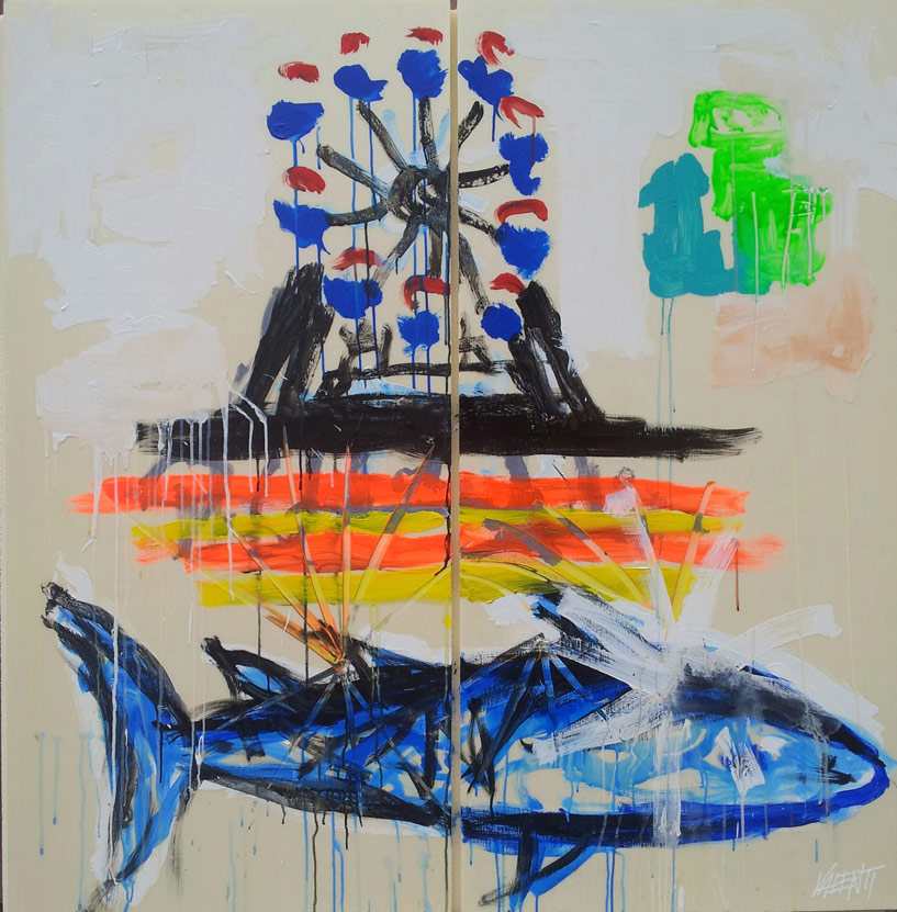 Ruota e squalo, 2014, 122 x 126 cm, acrilico su polistirene