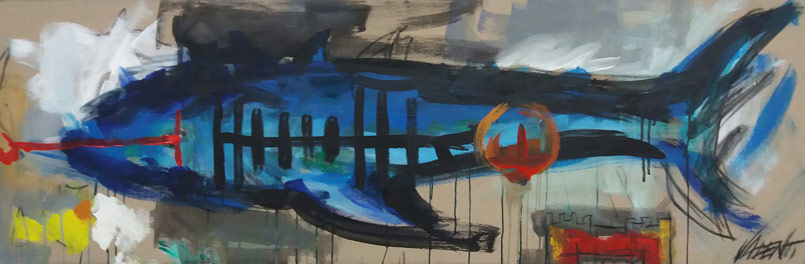 Squalo e castello, 2015, 150x50 cm, acrilico su tela